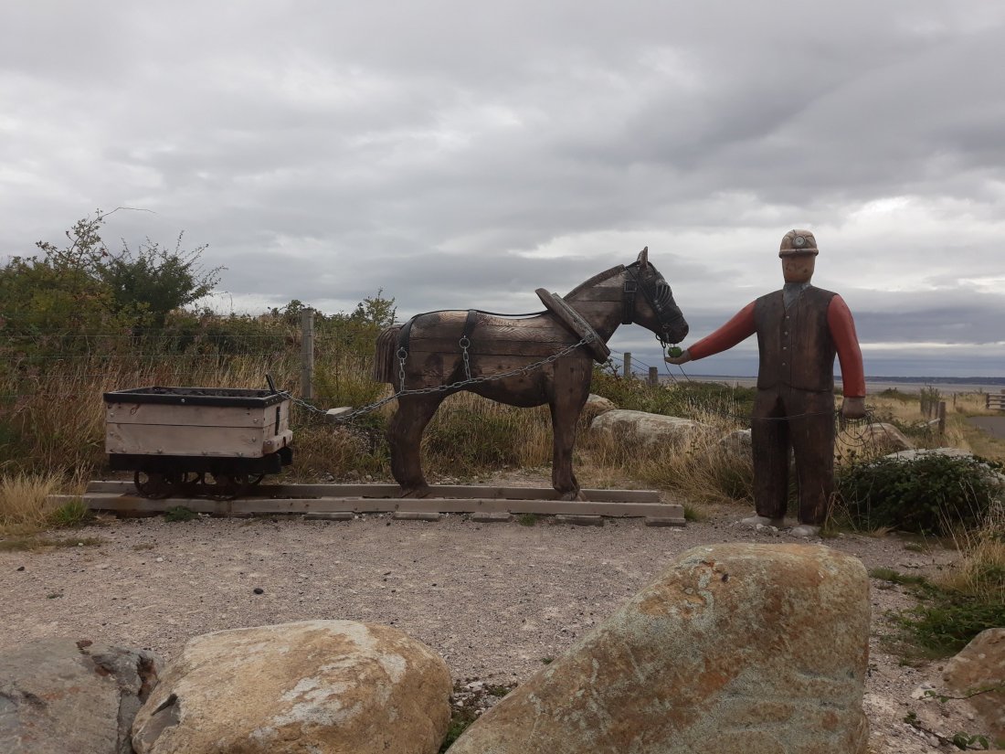 Parked in Prestatyn, and got the bus back to LLanerch Y Mor, touching post suitably touched and off I went with similar terrain as yesterday. Sadly this didn’t last and there was a long stretch on the road (about 3 miles) and I was glad when the next village marked the end of this. I had my snack on a convenient bench, and had a long conversation with a chap who joined me. The locals are very friendly and very keen to know what I am doing. I have now had 4 conversations that have pretty rapidly got to ‘you don’t sound like you come from round here’, so I have been able to wave the flag for South Nutfield and Surrey more generally! Just before lunch I reached the point of Ayr, through another park by a chemical works, with interesting displays and sculptures. The animal lover in me, really liked the chap giving the horse an apple! I suspect the apple may have disappeared previously as the stalk of it was a screw clearly holding it in place.