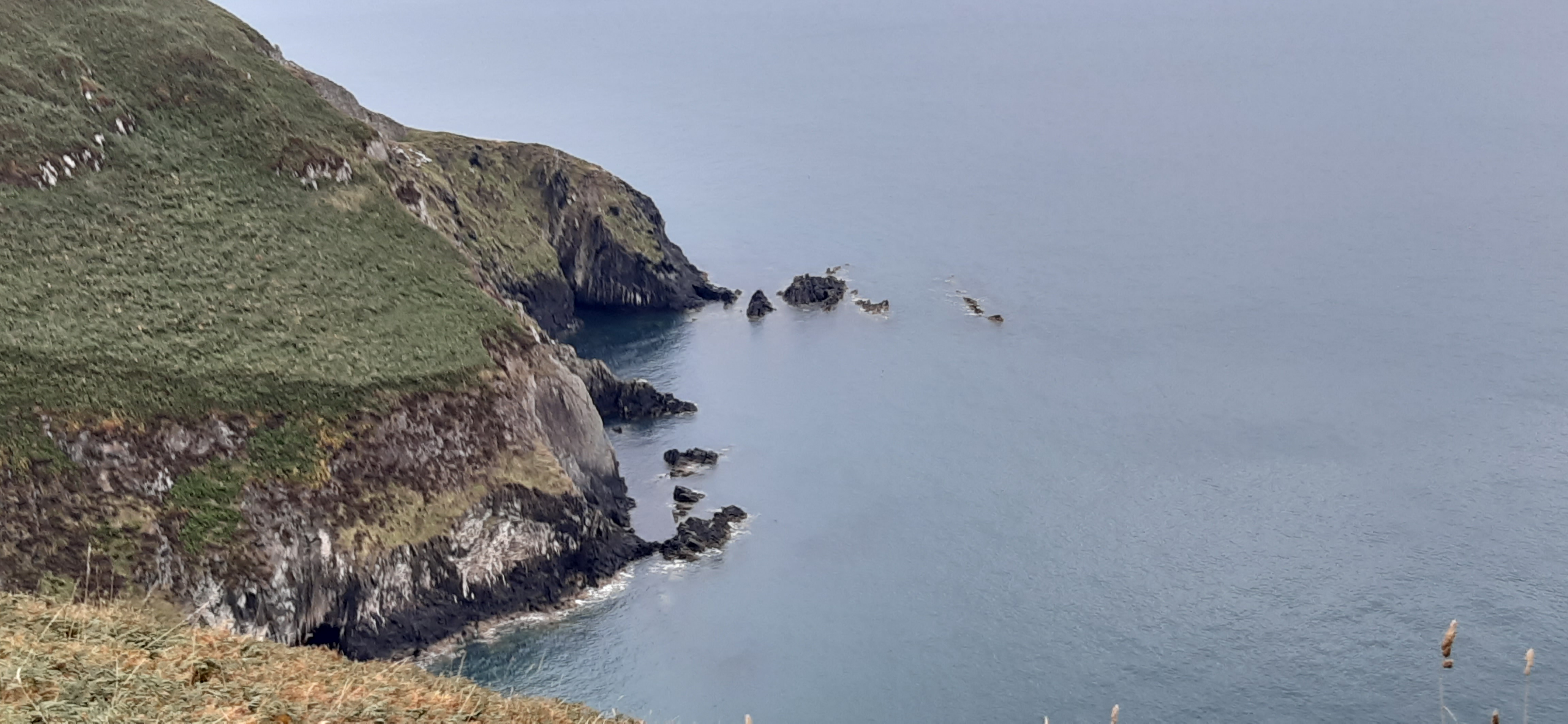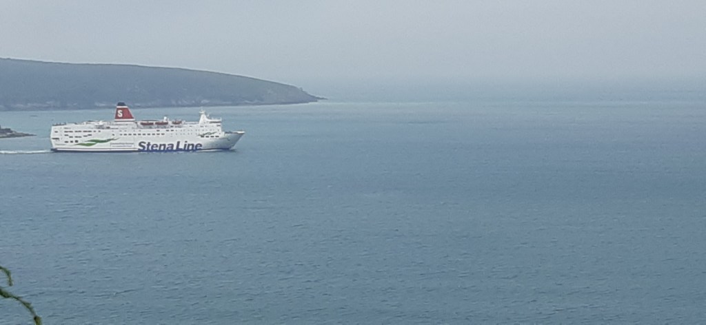 It was overcast with occasional drizzle, but as I progressed it got drier. The views were fantastic, and I saw the Irish ferry arrive and leave as I was making progress. There was a short stretch through a caravan park, and then the going suddenly got a lot rockier and more tricky. I took my time over this stretch which turned out to be about ½ a mile of more challenging terrain, until it settled back into an undulating grassy path. The path wound its way around the coast line and I saw my first bull (from the path with a good fence between me and it!).