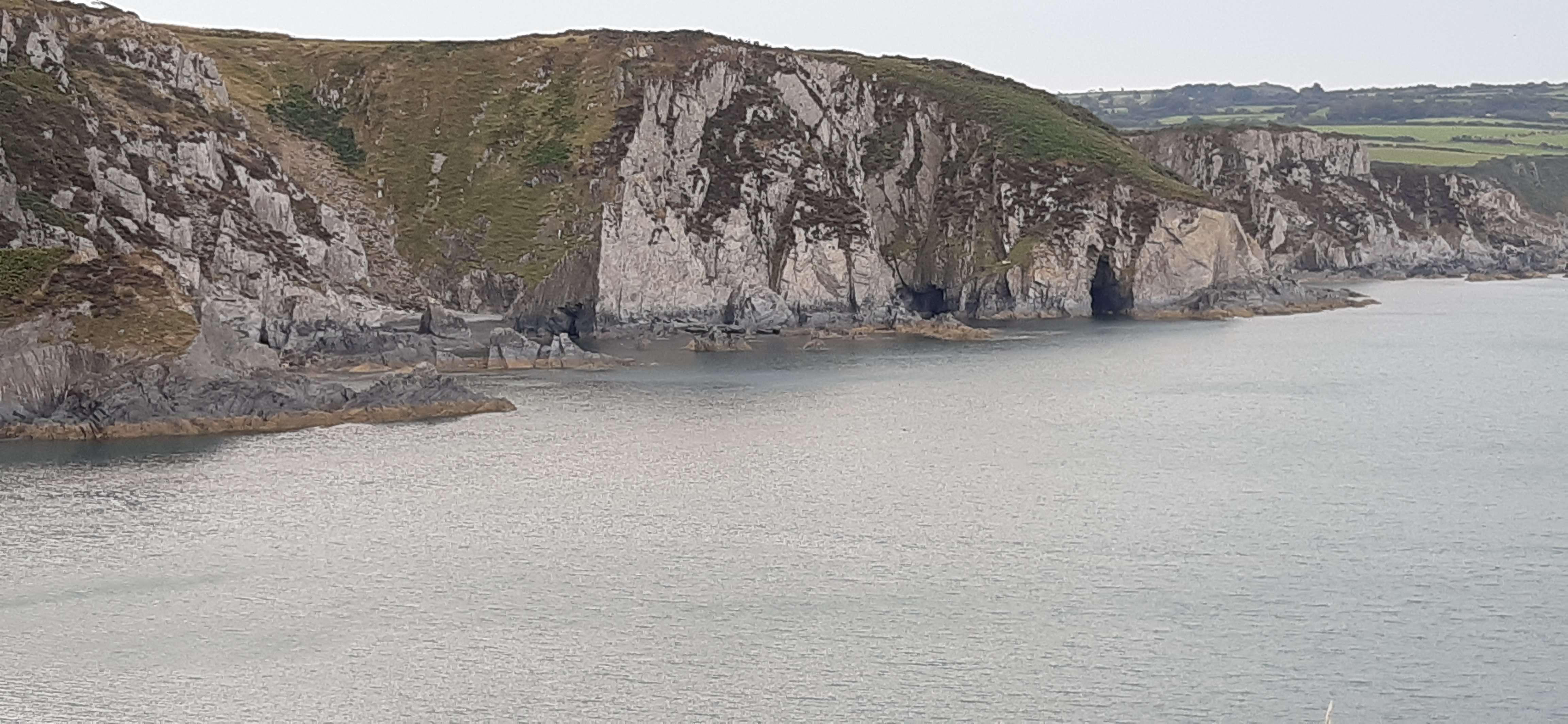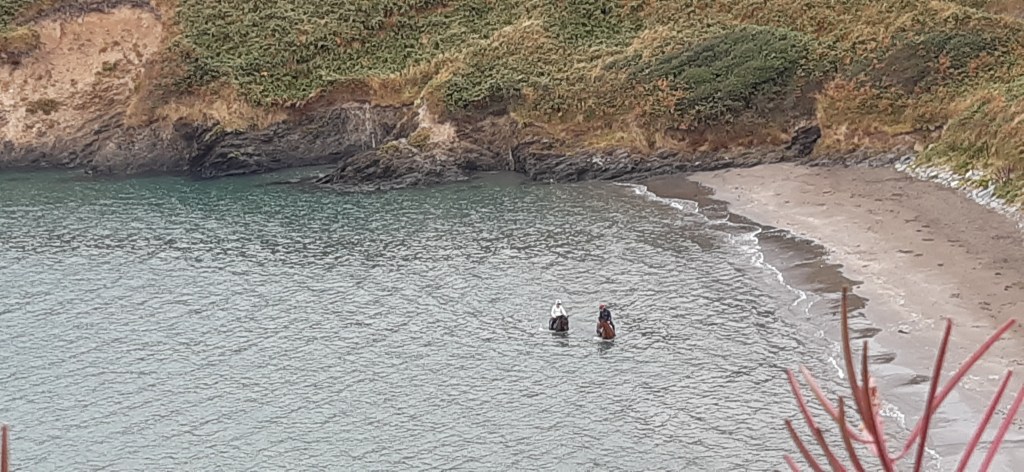 I availed myself of the facilities at Pwllgwaelod, touched the touching point established there on Wednesday and set off up to the cliffs. Whilst I was climbing some horses were being exercised in the bay – which was interesting to watch. It was quite an up and down route but mostly reasonably easy going. I had a coffee on one of the beaches sat on a rock. Lovely views continued as the path continued round the ‘crenulated’ coastline described in my Welsh Coast Path walk book.