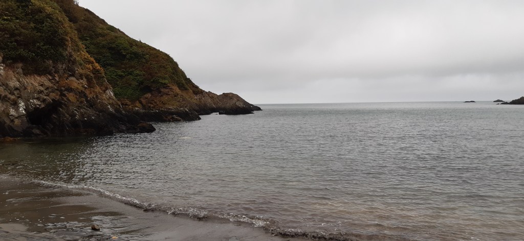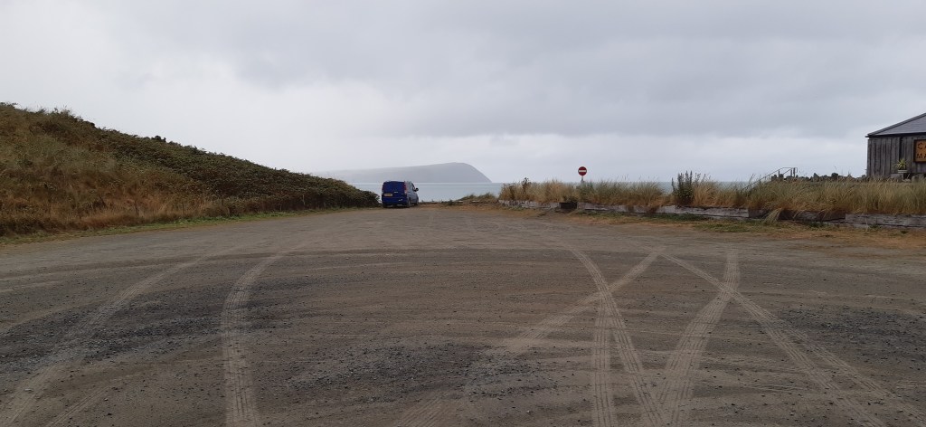 Had a leisurely start as I was aiming for the 10:16 Poppet Rocket from Pwllgwaelod to Newport Sands as my start to the day. This was only about 6 miles from base camp too. It was cooler and raining! I had plenty of time at Pwllgwaelod before the bus came to do all the necessary. It took about 20 minutes to get to my destination, which was enough time to feel queasy! I availed myself of the facilities at Newport Sands (as well as marvelling at the crowded car park of the Cat Rock Café!). I used a rock as a starting touching point and set off!