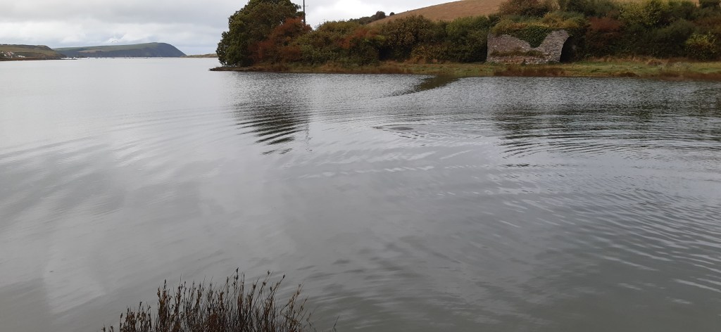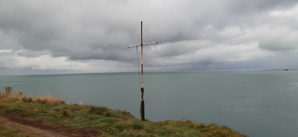 I carried on, there was another descent to a further stony bay with a lime kiln and stone stacks (plus a heron probably the one I saw earlier!). A final section up on the cliffs included a wide grassy path. This led out into the road and the descent into Cwm-yr-Ergwys. I had a brief sit on a bench (but sadly it rained again!) – so I walked back to Pwllgwaelod on the flat path I had used yesterday – I connected with the touching point and was pleased with how it had gone and all was well!