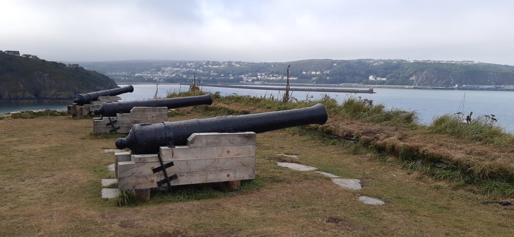 It ended at the fort above Fishguard – with splendid views and cannons (and a view showing the path travelled! One final slope up to the car park and mission accomplished!!!