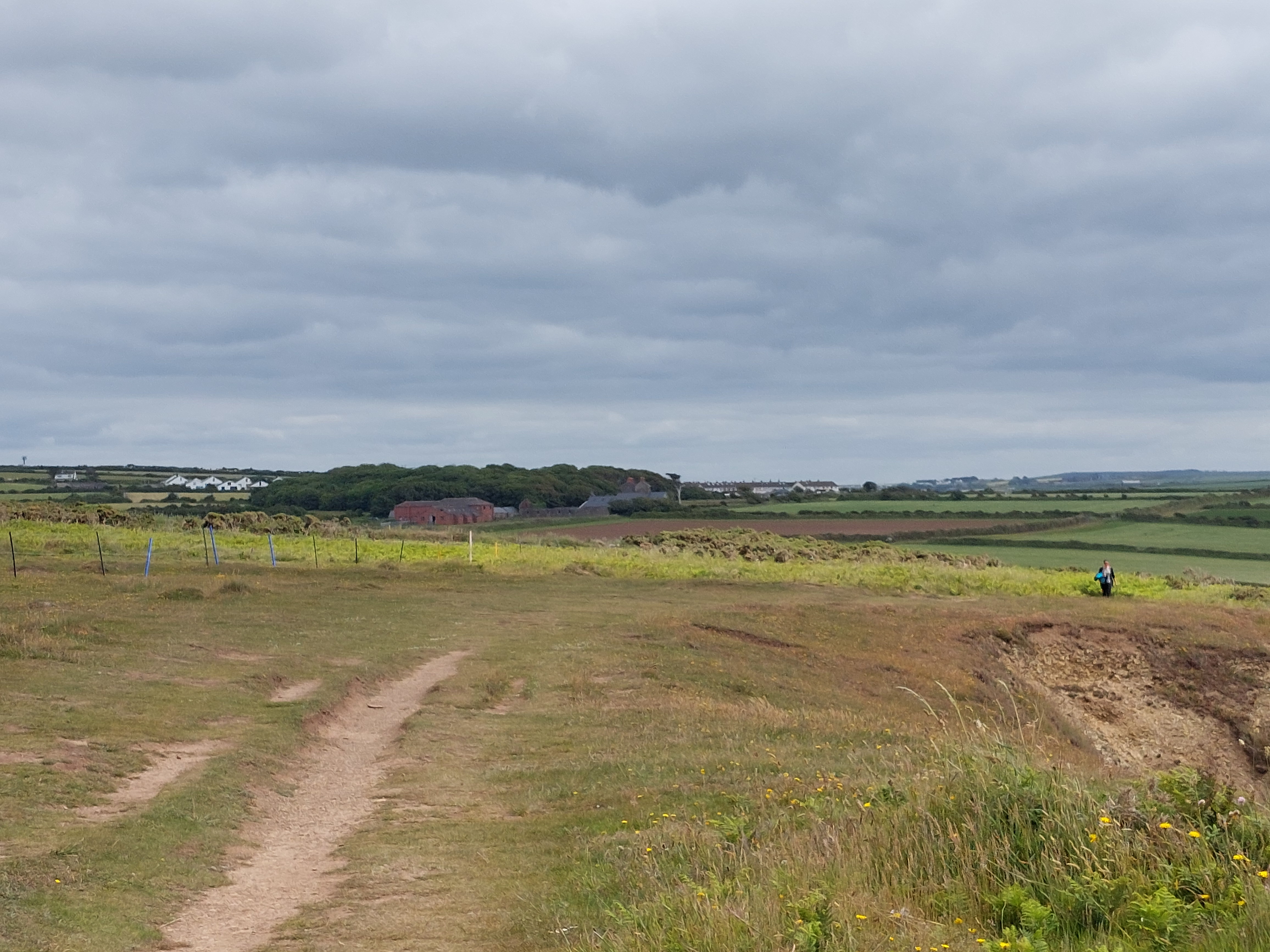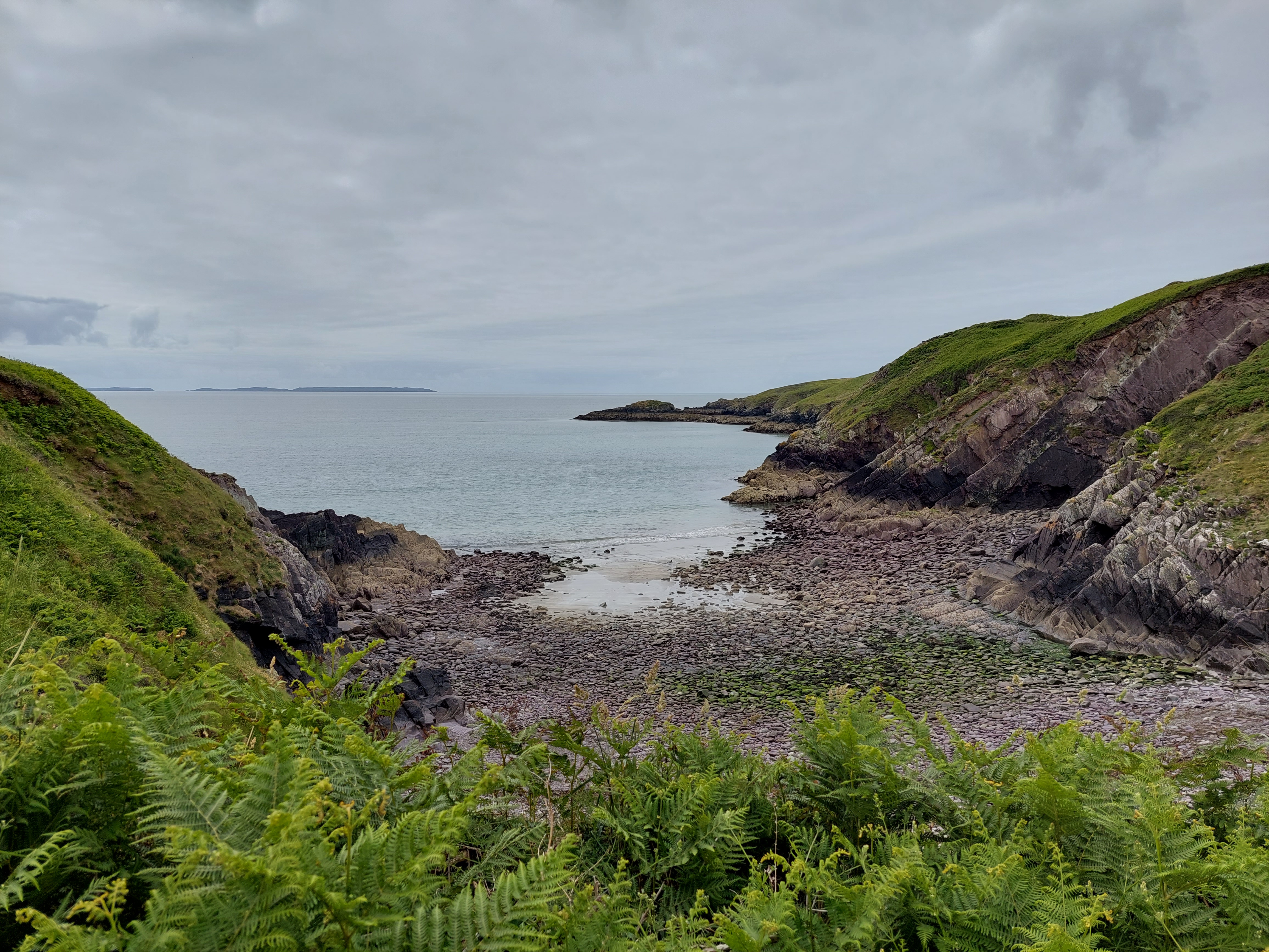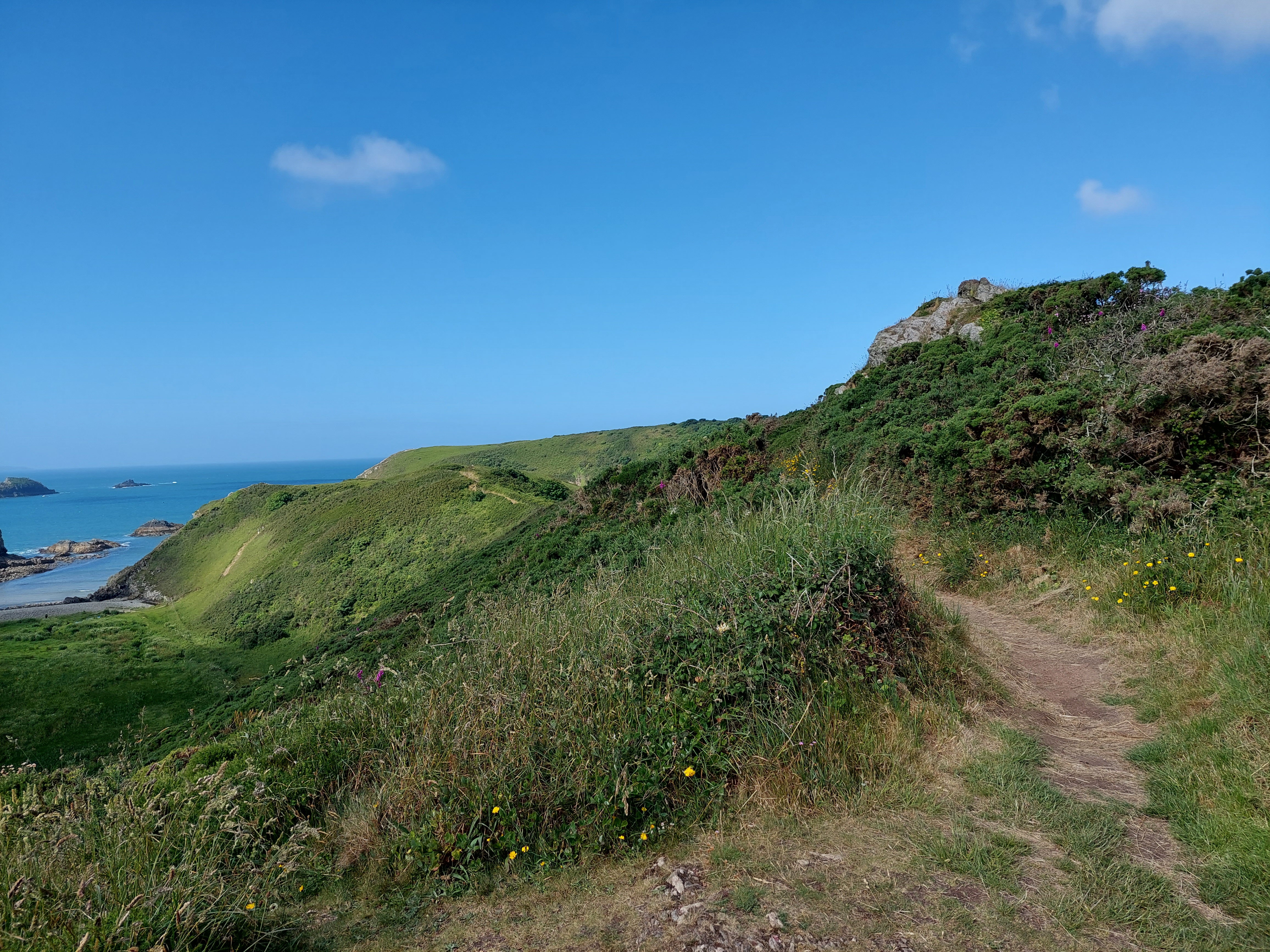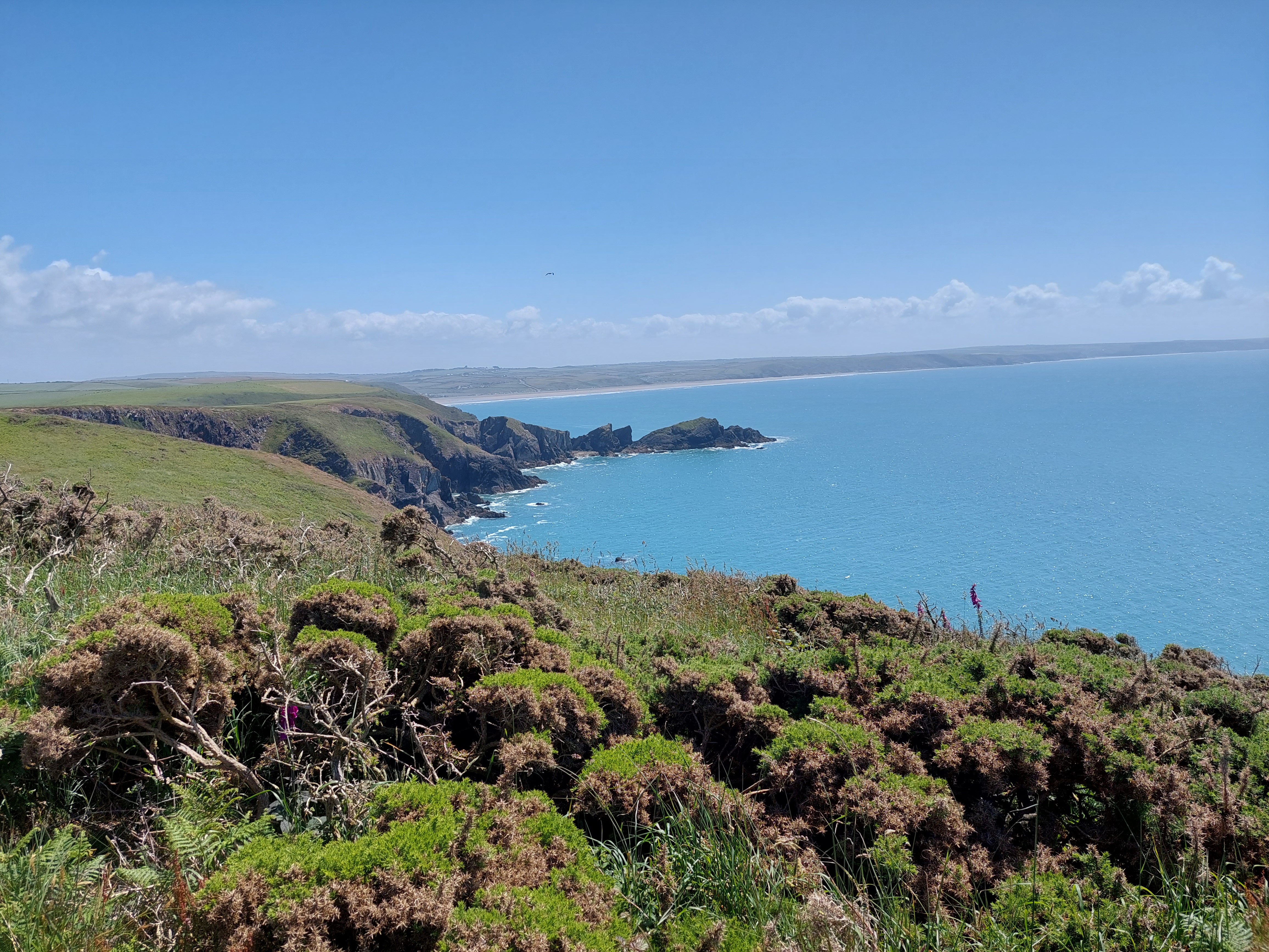 After the initial track, there was a long section on field paths and then a long stretch on an overgrown ‘green lane’. I briefly passed through the hamlet of Lochvane, and another stretch of ‘green lane’ followed. I had a coffee break in a field at the end sitting on the first style of this trip!. I descended down to the coast path at this point near Porthmynawyd (establishing a touching point) and people became much more numerous. The conditions were terrific, bright blue skies, sunshine and a good temperature for walking.