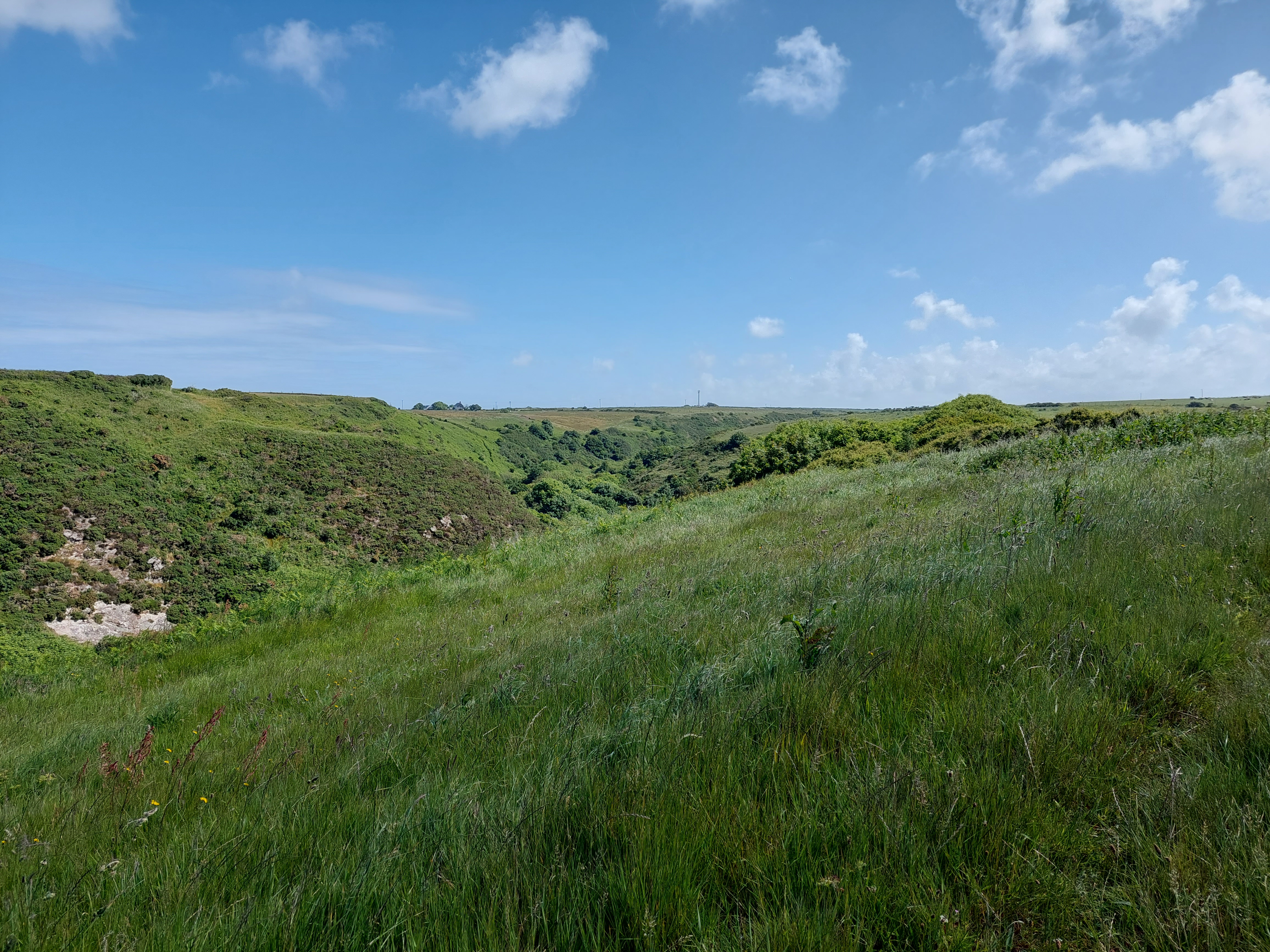 A particularly attractive stage of the coast path undulating down to Gwadn bay where I had initially turned off followed. I stopped for a second break to fortify myself for the climb back up the Gribin. It was steep but easier to get a grip going up. It was a relief to have negotiated it successfully. I was annoyed with myself that it had worried me! I wound back down to the village, which was very busy. I touched the touching point again, and indulged in a rum and raison ice cream. Yum!!!