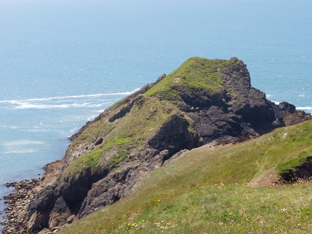 There was a stiff ascent to start with, and then a very pleasing section of undulating cliffs, starting with another fort site (no archaelogists) at Dinas Fach. I met at different points my neighbours again (and the ladies had even been in for a dip in the sea!). I got to a second long promontory (Dinas Fawr). I didn’t take the optional path on and off as it looked even more edgy then the Gribin had been.