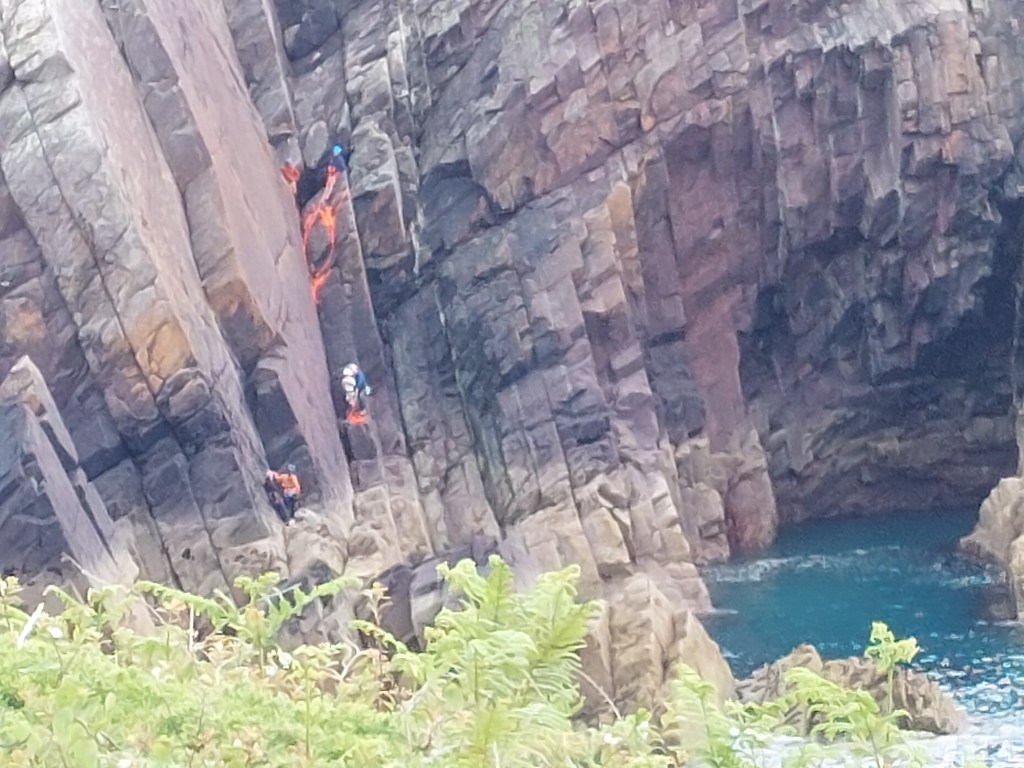 I wasn’t paying attention and started on the wrong path! After a straying into a caravan site and getting further away from the coast, I realised my mistake. Fortunately, I found a connecting path and was soon enjoying the delights of slightly lower cliffs than the last couple of days. I saw 2 lots of cliff climbers (the second lot being from Birmingham University) and a large group of ‘coasteerers’ initially on the rocks and then in canoes. I did think about doing such dangerous sports! I shan’t be trying them! There was again lots of people on the path. Interestingly several Americans, and four of my fellow travellers on the bus had been German.