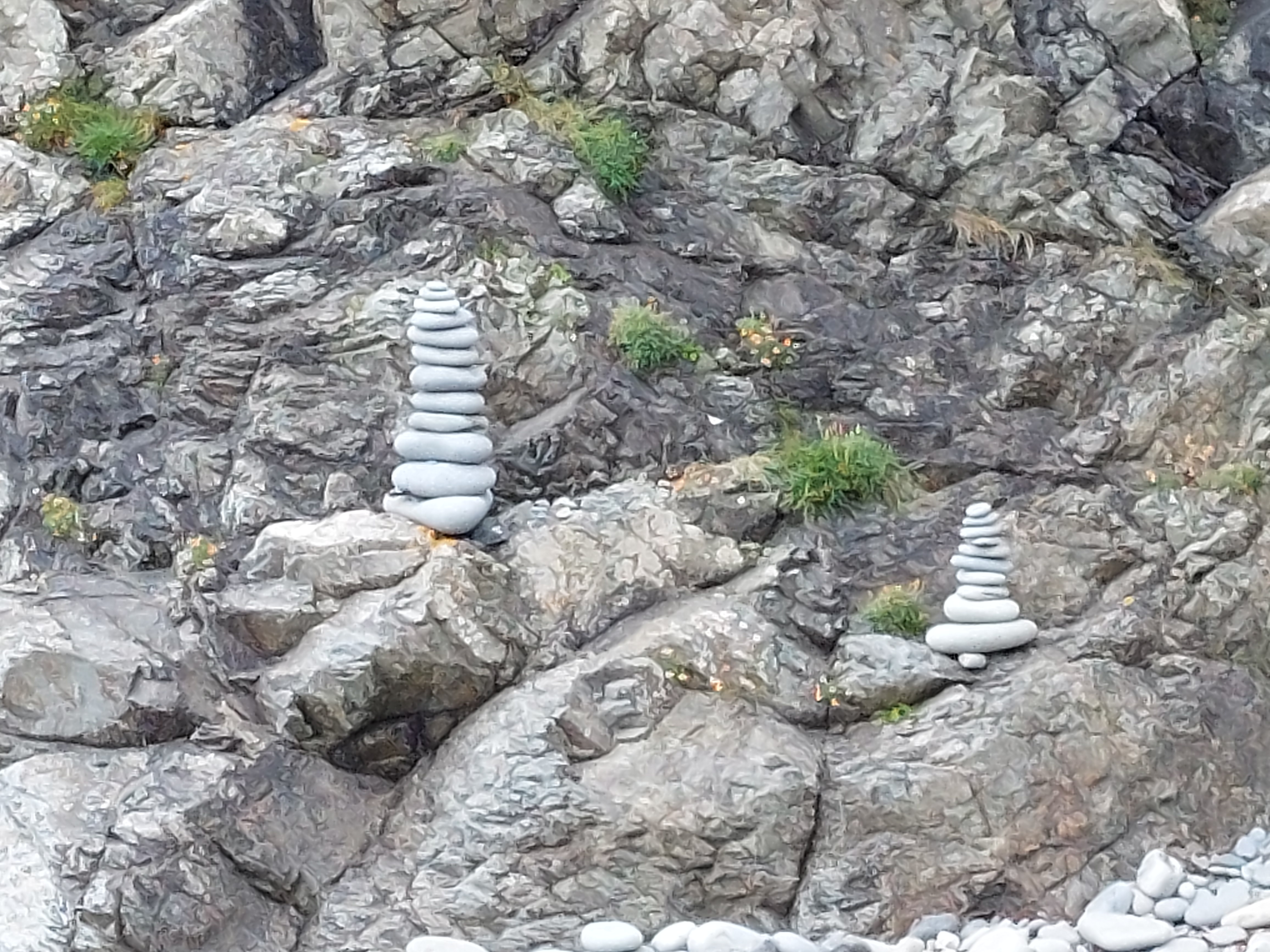 The route was rocky in places, and undulating but generally it kept height pretty well. I had to descend down at Caer Bwdy, and lost some height near Trelerw. There was a steep final descent into Porth y Rhaw (not as steep as the Gribbin), but this afforded more excellent views of the Archaelogical dig I saw on Saturday (no digging today), and how this point had been a fort back in the day. Here I had set up a touching point on Saturday’s walk – which I duly touched. I had my lunch overlooking the inlet, and eventually spotted some stone sculptures.