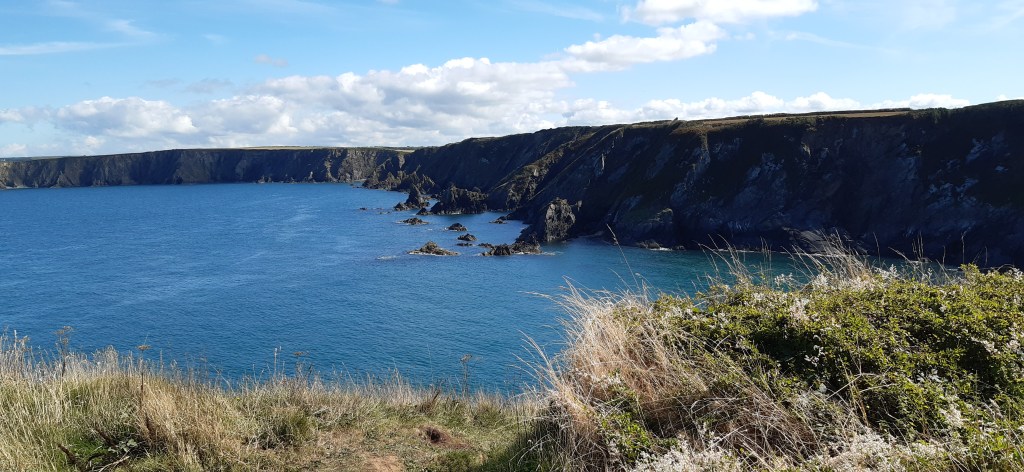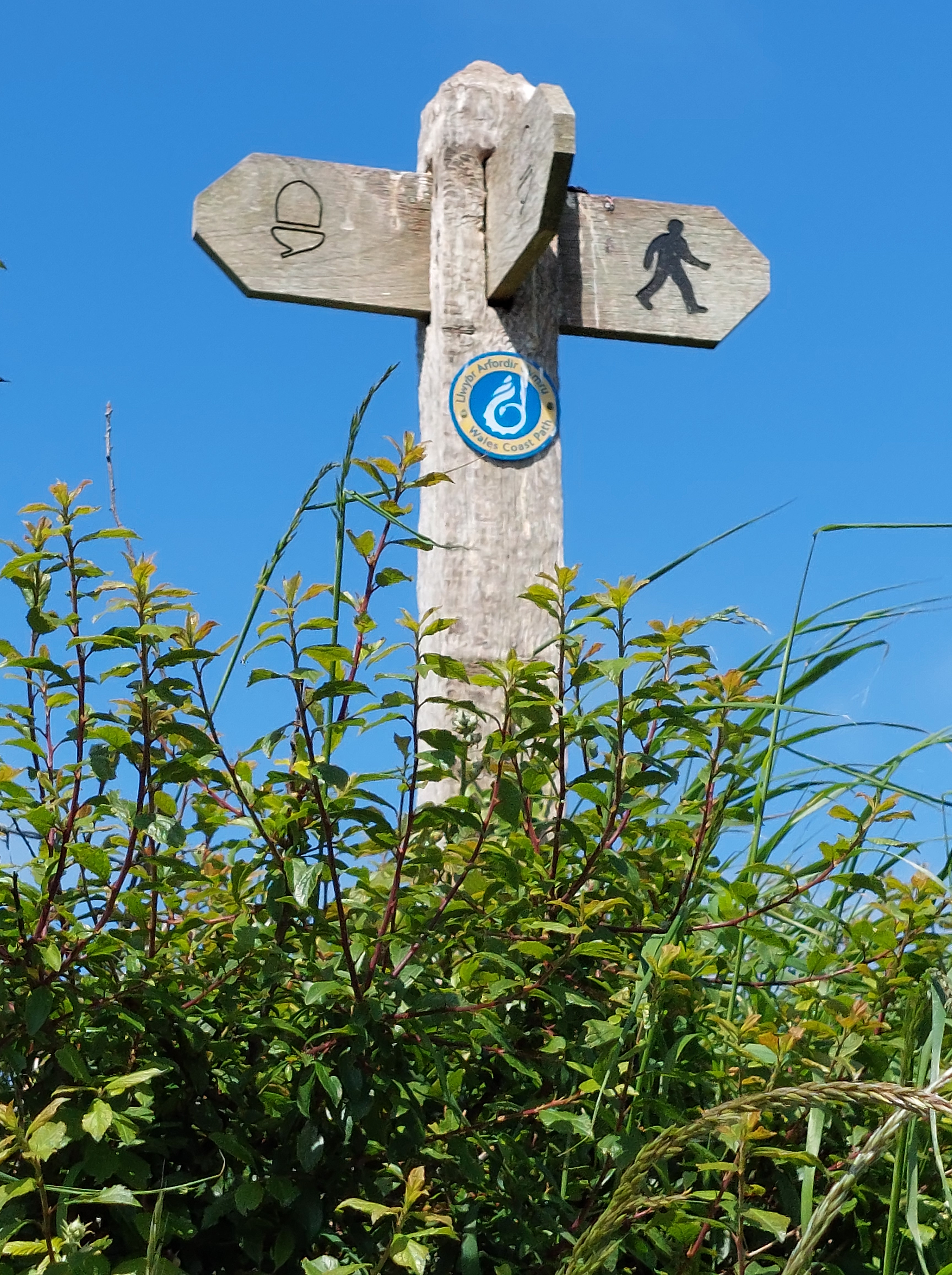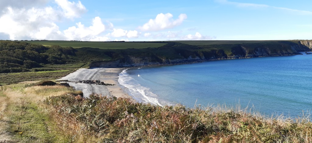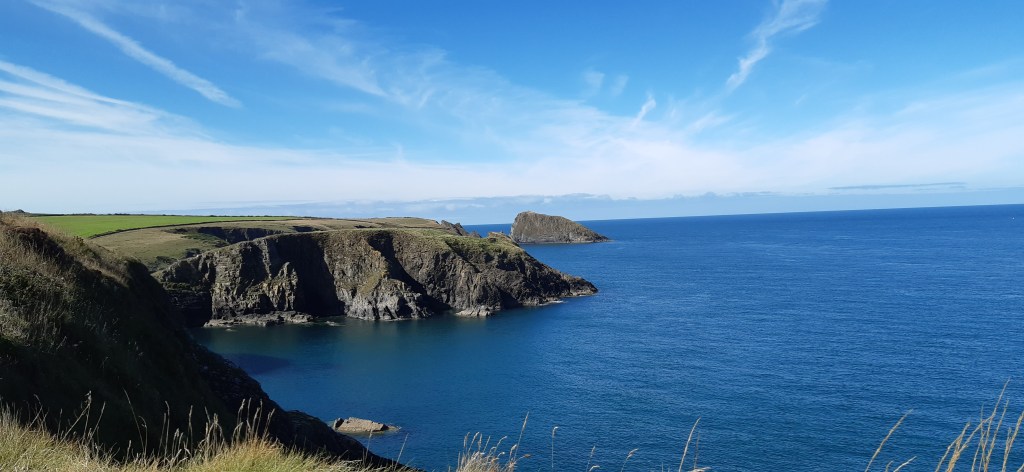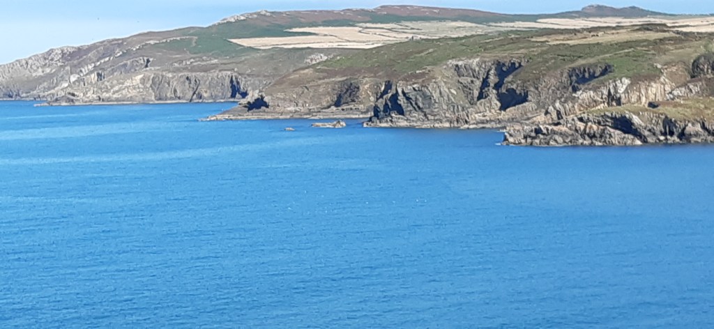 After the initial track, there was a long section on field paths and then a long stretch on an overgrown ‘green lane’. I briefly passed through the hamlet of Lochvane, and another stretch of ‘green lane’ followed. I had a coffee break in a field at the end sitting on the first style of this trip!. I descended down to the coast path at this point near Porthmynawyd (establishing a touching point) and people became much more numerous. The conditions were terrific, bright blue skies, sunshine and a good temperature for walking.