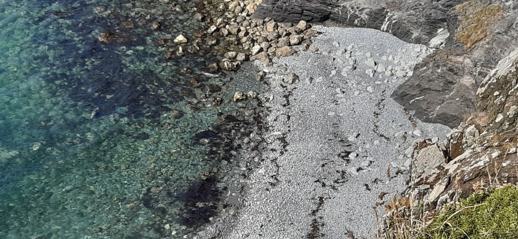 A particularly attractive stage of the coast path undulating down to Gwadn bay where I had initially turned off followed. I stopped for a second break to fortify myself for the climb back up the Gribin. It was steep but easier to get a grip going up. It was a relief to have negotiated it successfully. I was annoyed with myself that it had worried me! I wound back down to the village, which was very busy. I touched the touching point again, and indulged in a rum and raison ice cream. Yum!!!