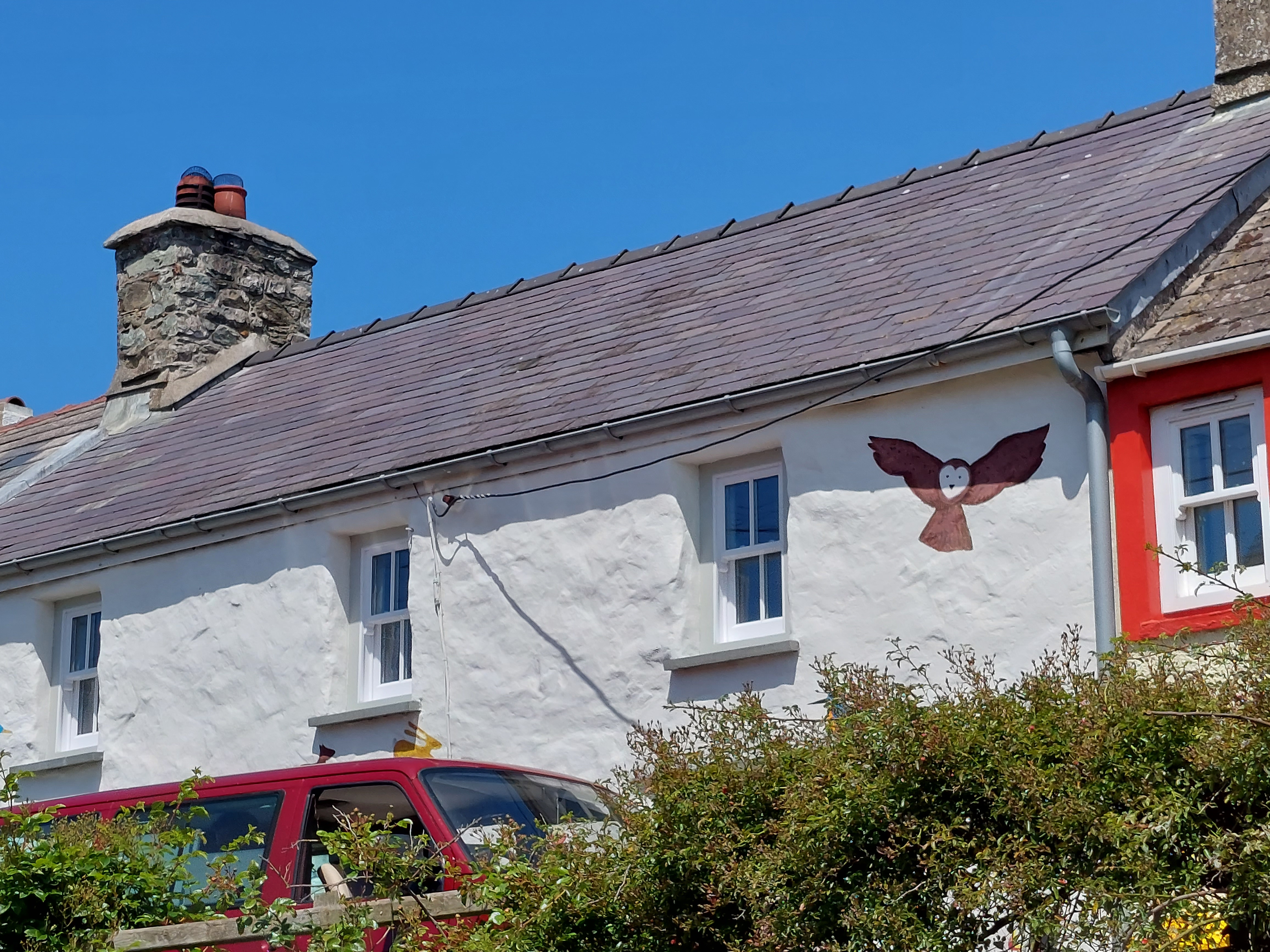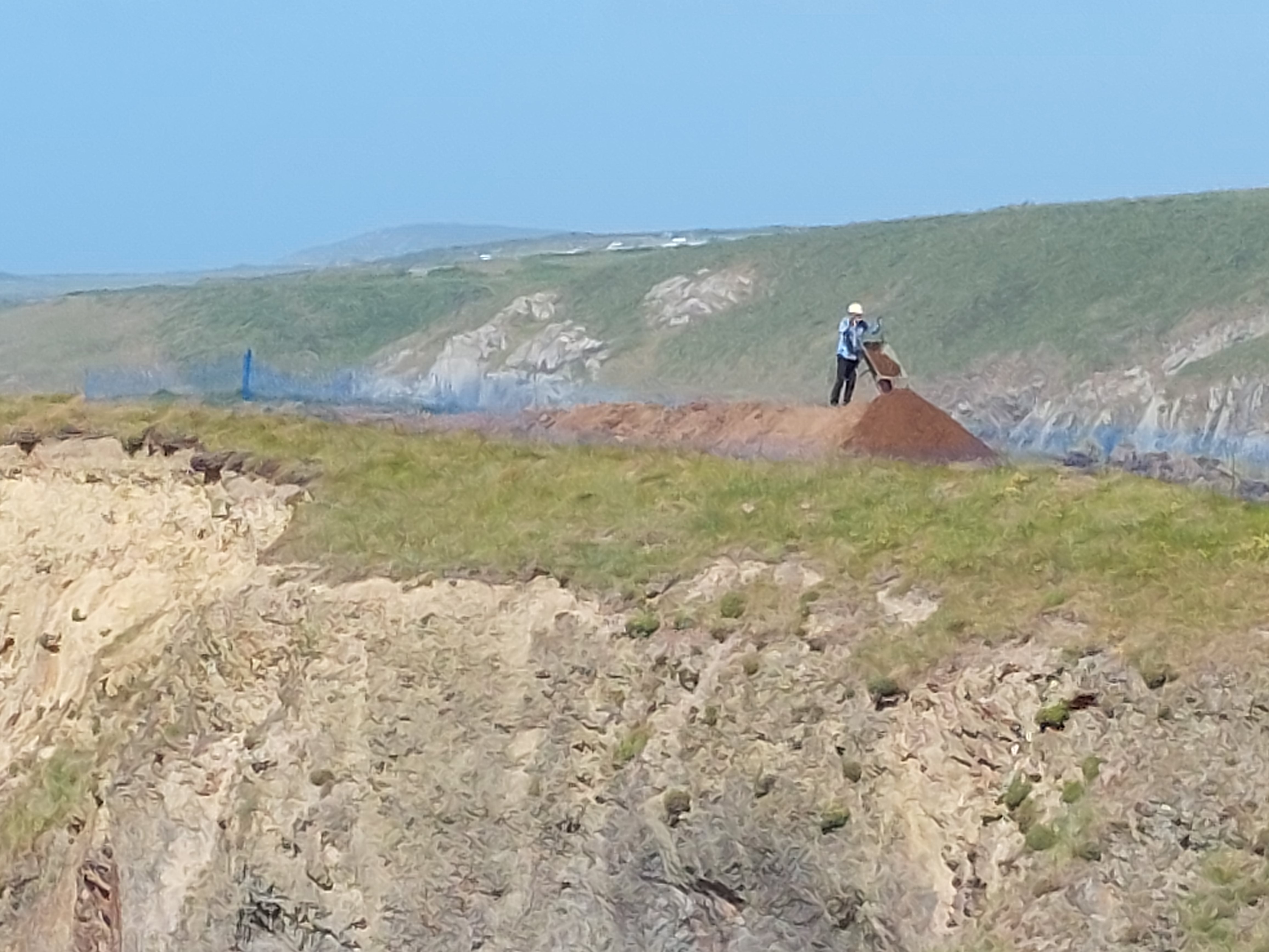 The route was rocky in places, and undulating but generally it kept height pretty well. I had to descend down at Caer Bwdy, and lost some height near Trelerw. There was a steep final descent into Porth y Rhaw (not as steep as the Gribbin), but this afforded more excellent views of the Archaelogical dig I saw on Saturday (no digging today), and how this point had been a fort back in the day. Here I had set up a touching point on Saturday’s walk – which I duly touched. I had my lunch overlooking the inlet, and eventually spotted some stone sculptures.